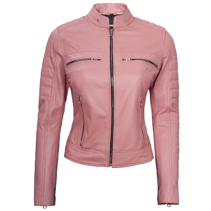 Material: Real Leather Internal: Soft Lining Front: Zipper Closure Collar: Stand Up Collar Color: Pink